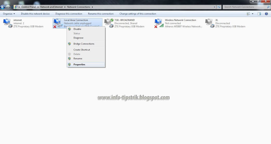 4.Arahkan mouse kamu pada ikon Local Area Connection, kemudian klik kanan dan pilih Properties.