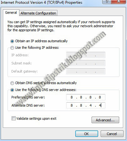 [Nah ini DNS publik Google: 8.8.8.8 dan 8.8.4.4. Dan jika anda ingin memakai DNS yang lebih cepat dan stabil bisa tanya ke Om Google]